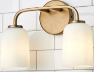 | Bathroom Vanity | Shades of Light | Verlice Vanity Light – 2 Light | BS23061 | 13.75”x9.75” | Aged Brass | One over each vanity sink for double vanities. | $$ | NOVEL, RENDER, HARMON |