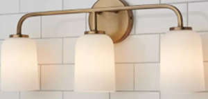 | Bathroom | Golden Lighting | Zoey 3 Light Bath Vanity | 6956-BA3 OG-WHT | 24”x9.5”x 7.25” | Olympic Gold with Matte White shades | Center over mirror. Furnish and install 400 lumen 3000K LED Edison Bulb. | $ | RENDER, HARMON, NOVEL |